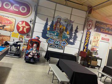 1200 sq ft Room with Antiqued Decor. 3 Vintage Small Kids Rides. 65in Smart TV, Food and Gift Tables, Up to 4-6ft Tables with Benches. You May Also Access the Pool Area (No Swimming) The Covered Patio, 2 Sets of Regulation Corn Hole Board Sets Under the ”Front Carport Style” Patio.